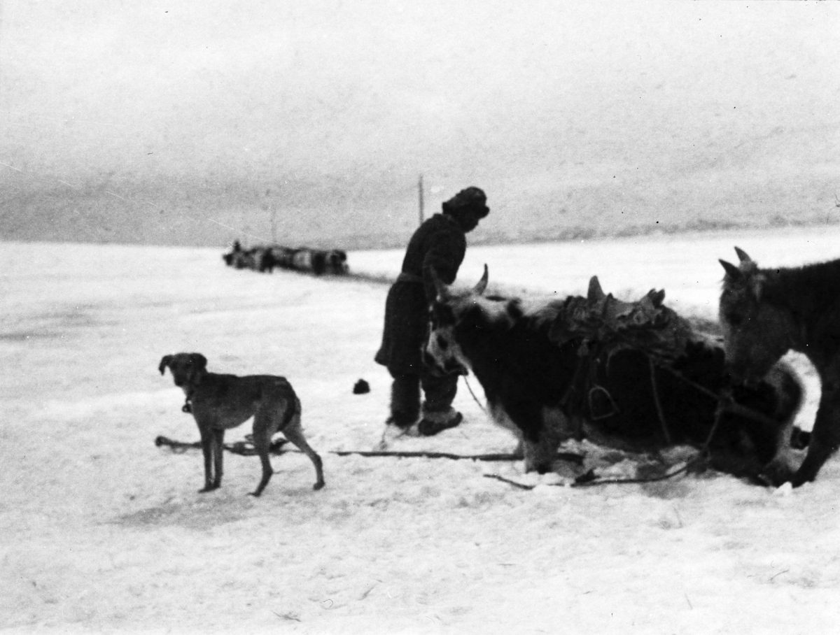 Kazak, ox, greyhound, Lao Feng K'ou (Laofengkou); snowy plain.