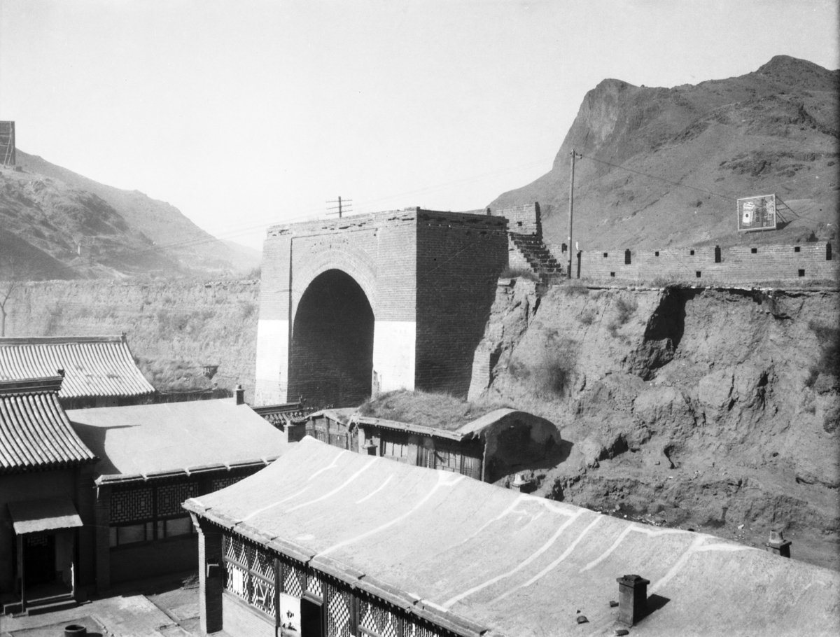 Kalgan gateway [Zhangjiajou]; large city gate with roof top in foreground; city wall; hills in background.