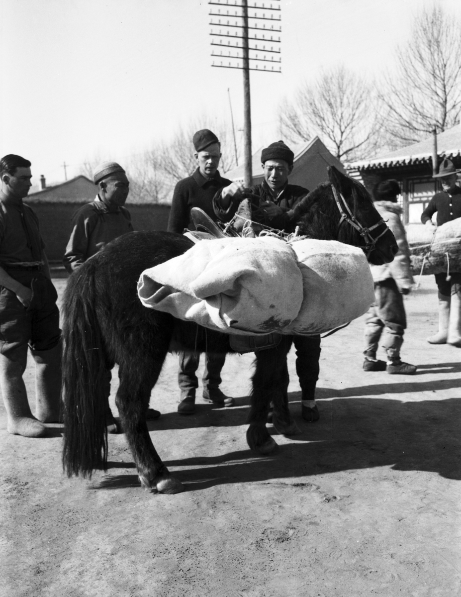 "Kuei-Hua [Hohhot], loading pack-pony; telephone pole; buildings in background; 6 men standing around."