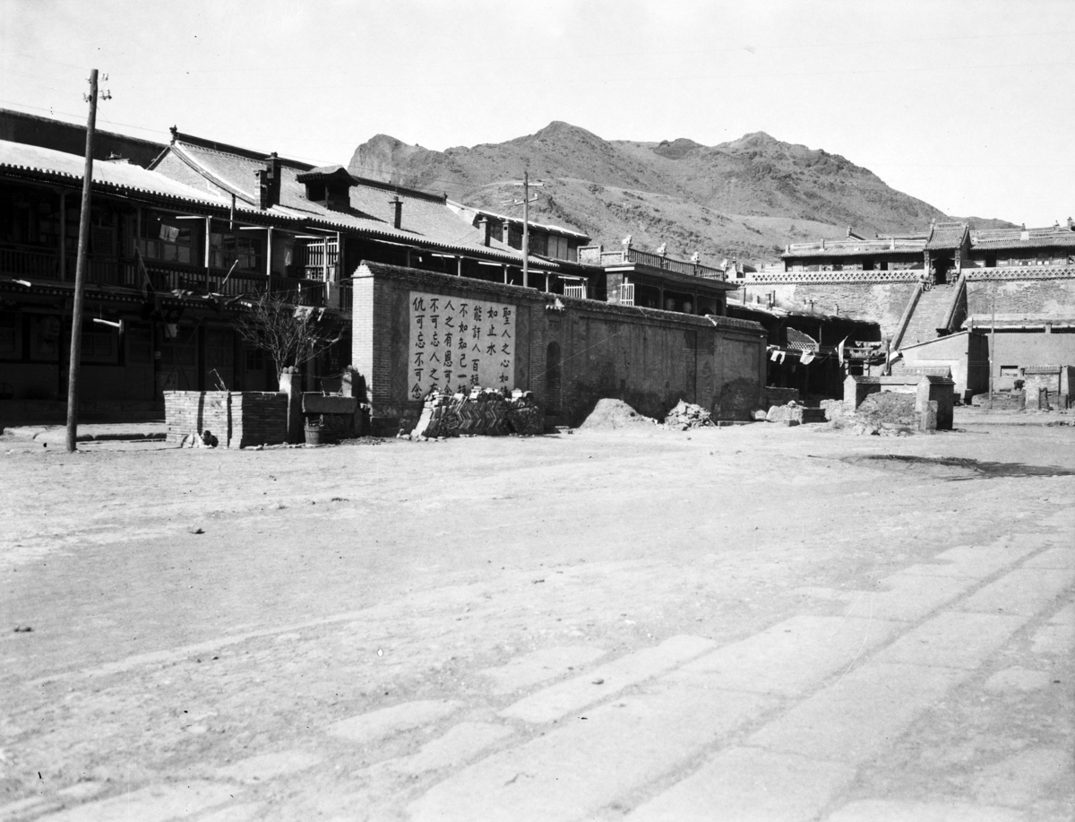 Kalgan [Zhangjiakou] street scene; building and city wall; wall with Chinese philosophical sayings painted on it