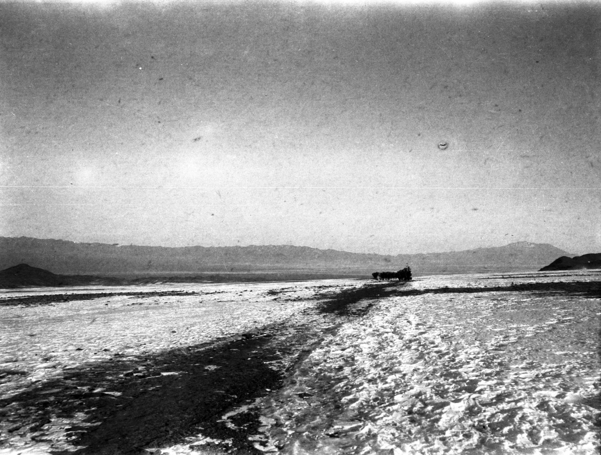 Caravan approaching Dead Mongol Pass "[Koumenzi]; caravan in far distance; snowy plain