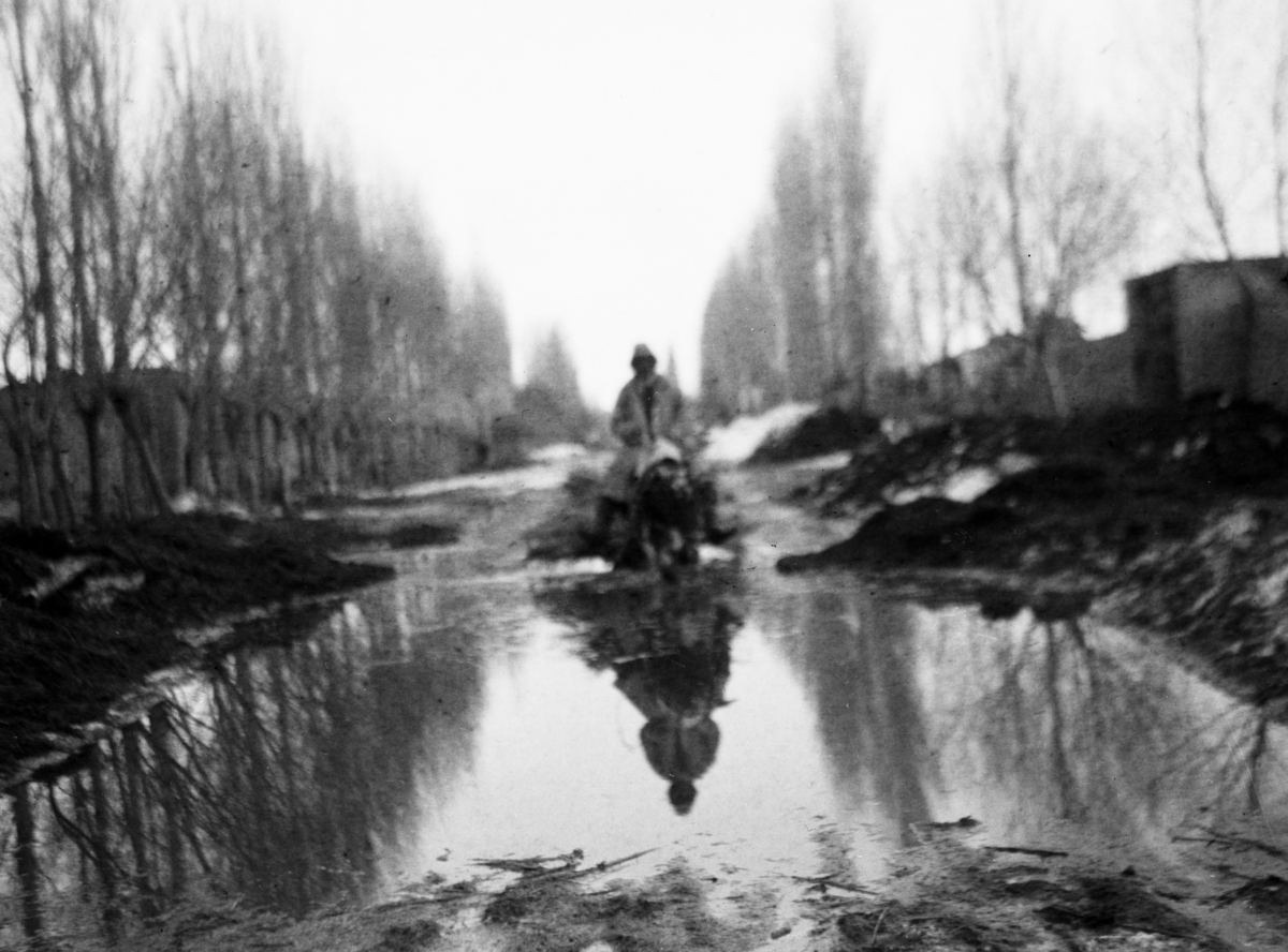 Sleigh, street of melted ice, Dorbujing [Emin]; perfect reflection