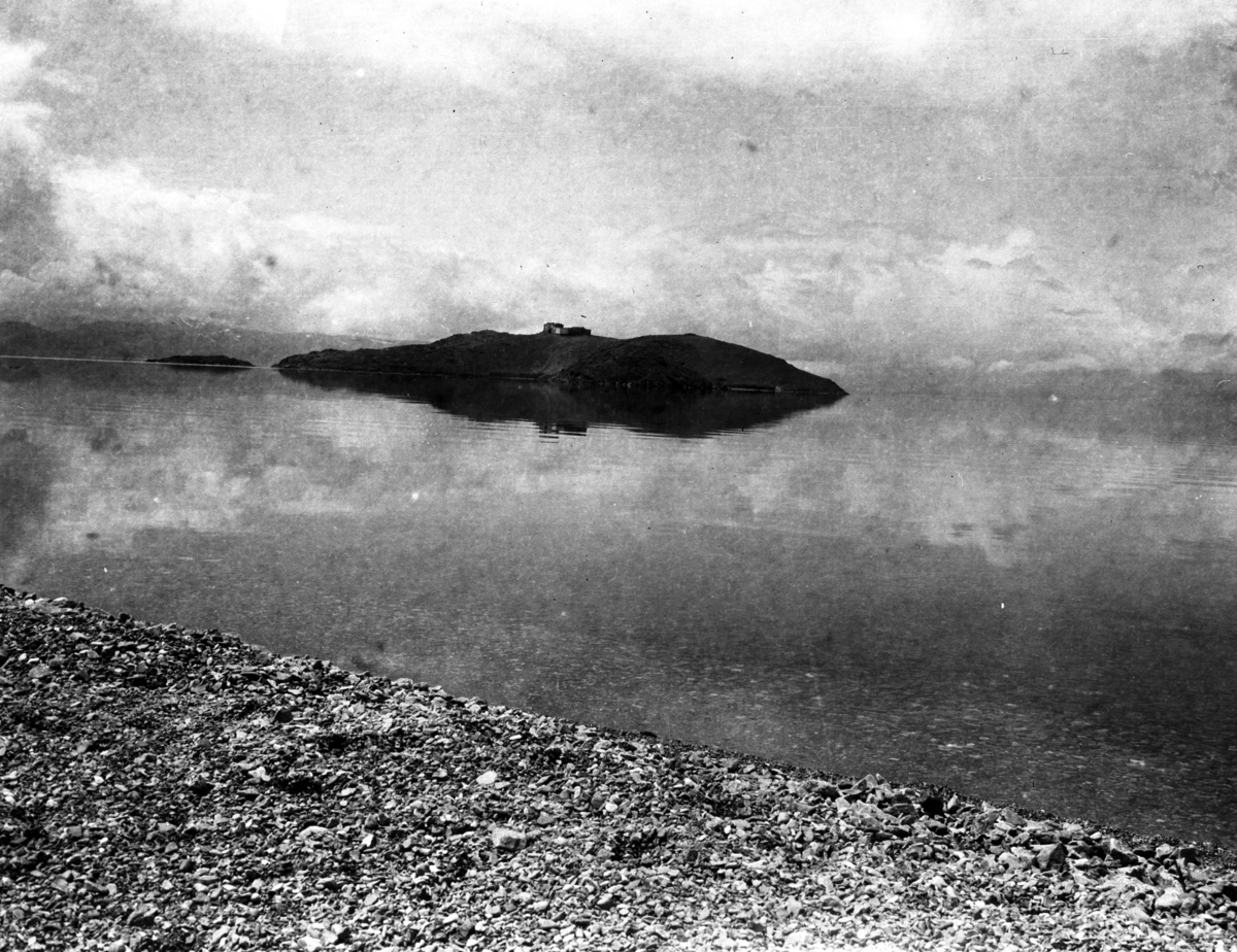 Island and temple in the holy lake of Sairam [Sailimuthi] Nor, Urumchi to Kulja (off print); Sairam Nor, Island
