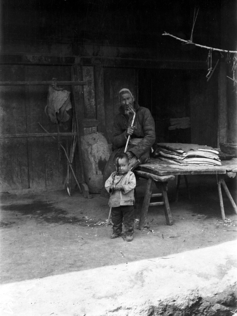 A T'ung Kan patriarch and his grandson (off print); Old man and child, Turfan [Turpan] Road'; shop; street