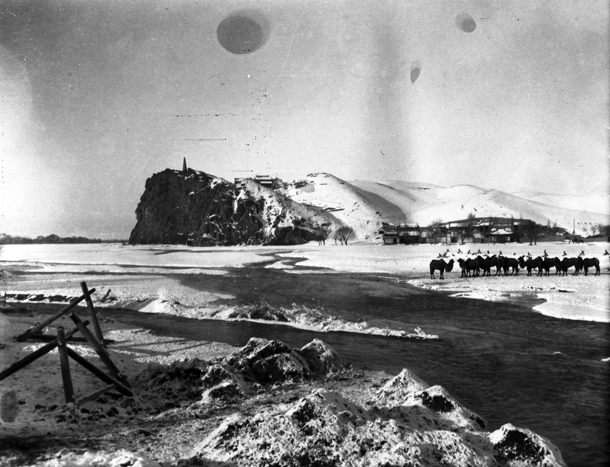 Urumchi [Urumqi] river, Hung Shan [Hong Shan Zuizi] tsuei-tze snow; buildings; building and tower on a hill rising sharply from a snowy plain at the base of hill