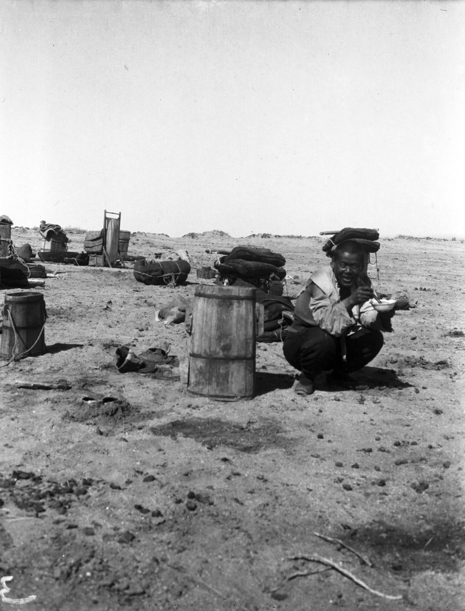 Moses eating; [W. Edsin Gol?] location not give; Moses crouched with water buckets and other camp equipment in background