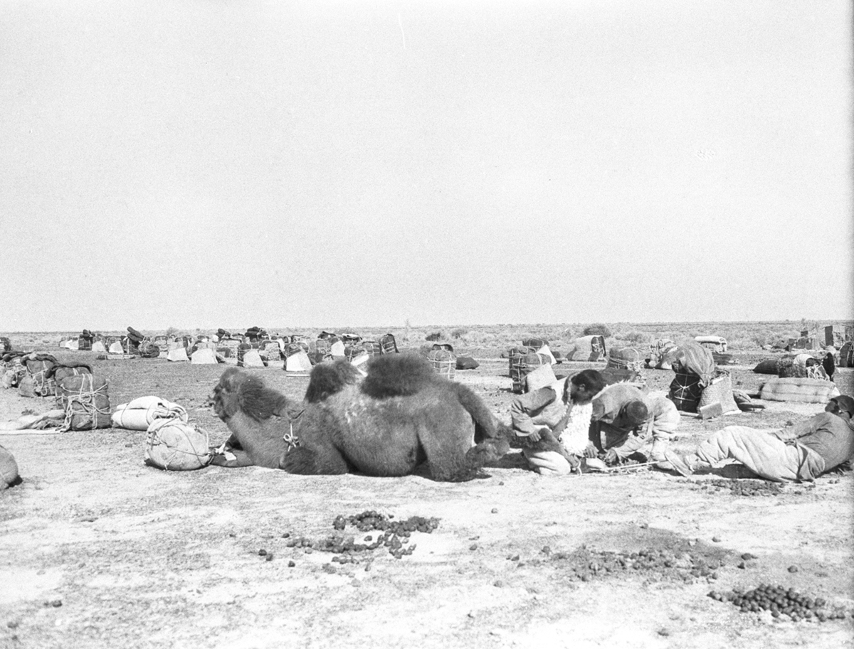 Cobbling camel hoof, Tueirh Shan (Twin Mountains); Cobbling a camel's hoof, sewing a patch over a blistered spot (from TDRT p 206); Two men working an immobilized camel; camp supplies spread out in background