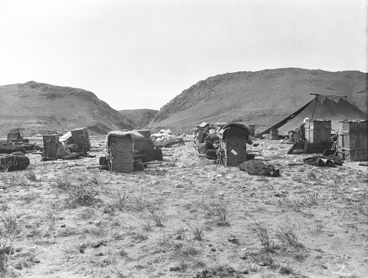 Camp at Morhgujing; tent with large bundles of camp supplies scattered around