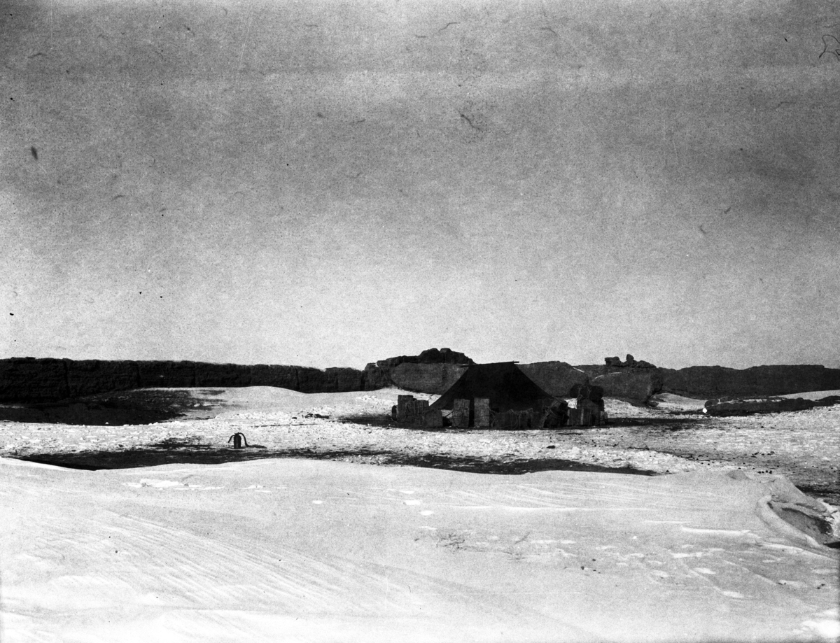 Nearing Ku Ch'eng-tze: camp, ruined inn; tent set up in snowy plain, ruined inn in background