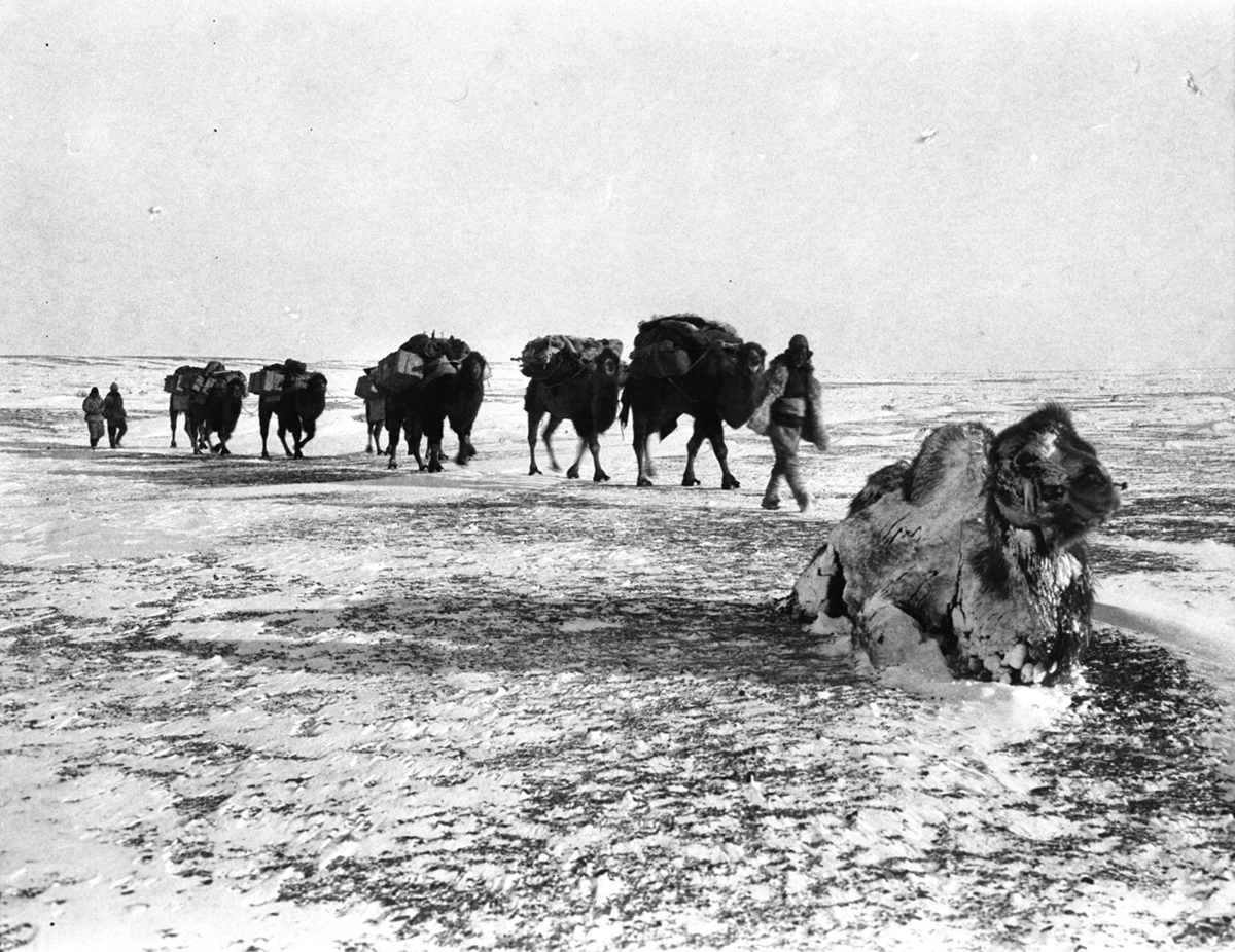 Nearing Ku Ch'eng-tze: frozen camel: my caravan approaching; Waiting for death: A camel 'thrown on the Gobi', sheeted with frozen snow from TDRT p 306