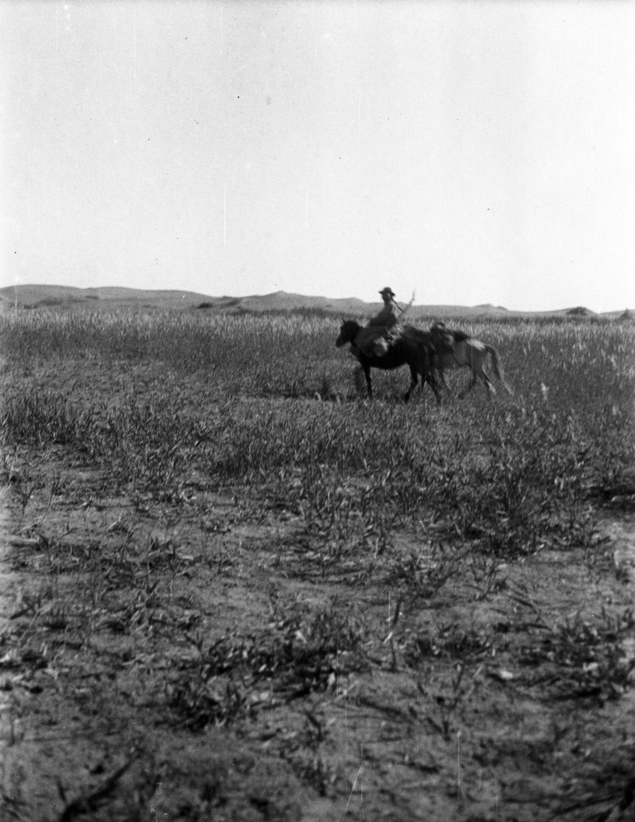 Mongol traveling, Kuai-tze Hu [Orgt Gol]; single horseman in distance grassy plain
