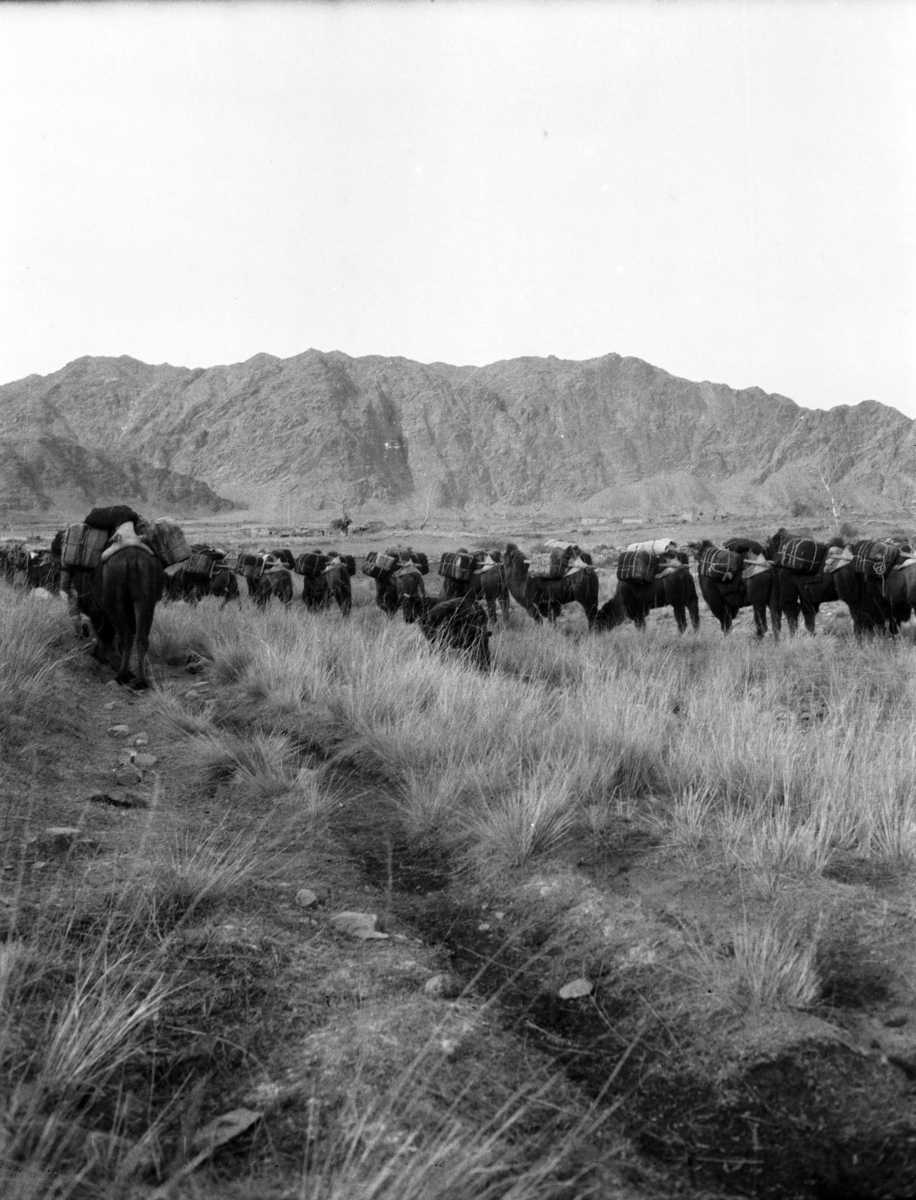 Camels at White Poplar River [river near Yiwu] (near Tuhulu); White Poplar River. The first oasis of Turkestan in the foothills of the Qarliq Taugh p. 226 TDRT caption; stage 69; rear view of camels