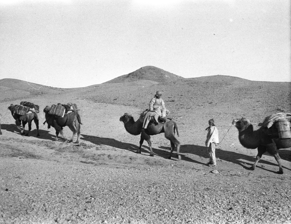 Chou; Wa-wa; camels: Gobi; caravan with one man riding and one leading a camel