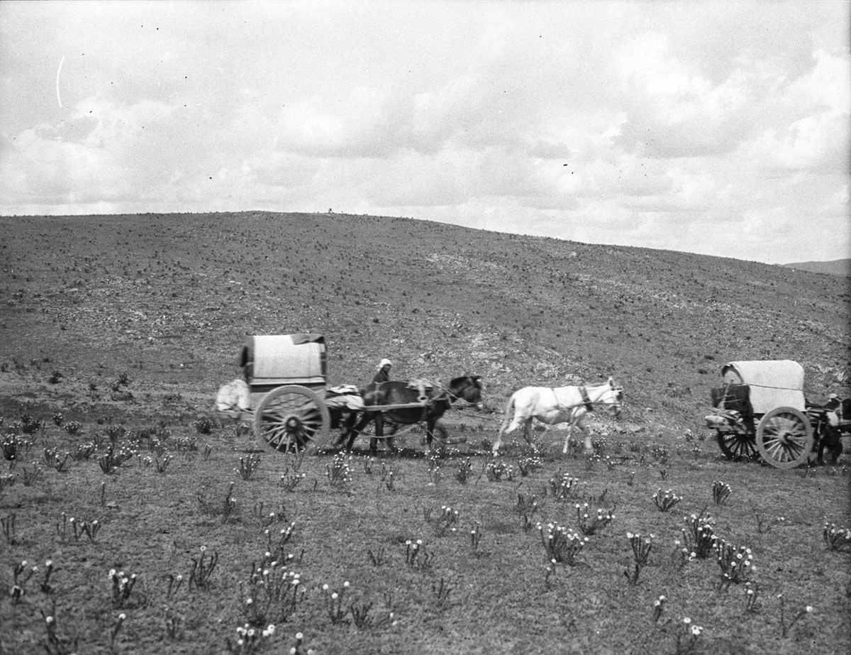 Two mule carts on plains; presumably near Hohhot; grasslands; two wheel covered wagons