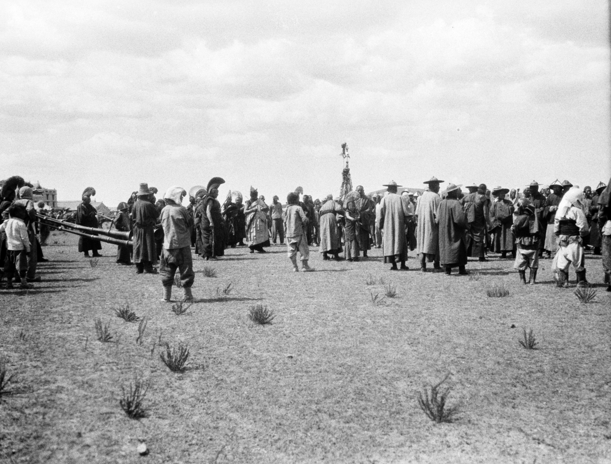 Chao Ho, devil dance, trumpeters and crowd; elaborately robed participants out in a field; very long trumpets