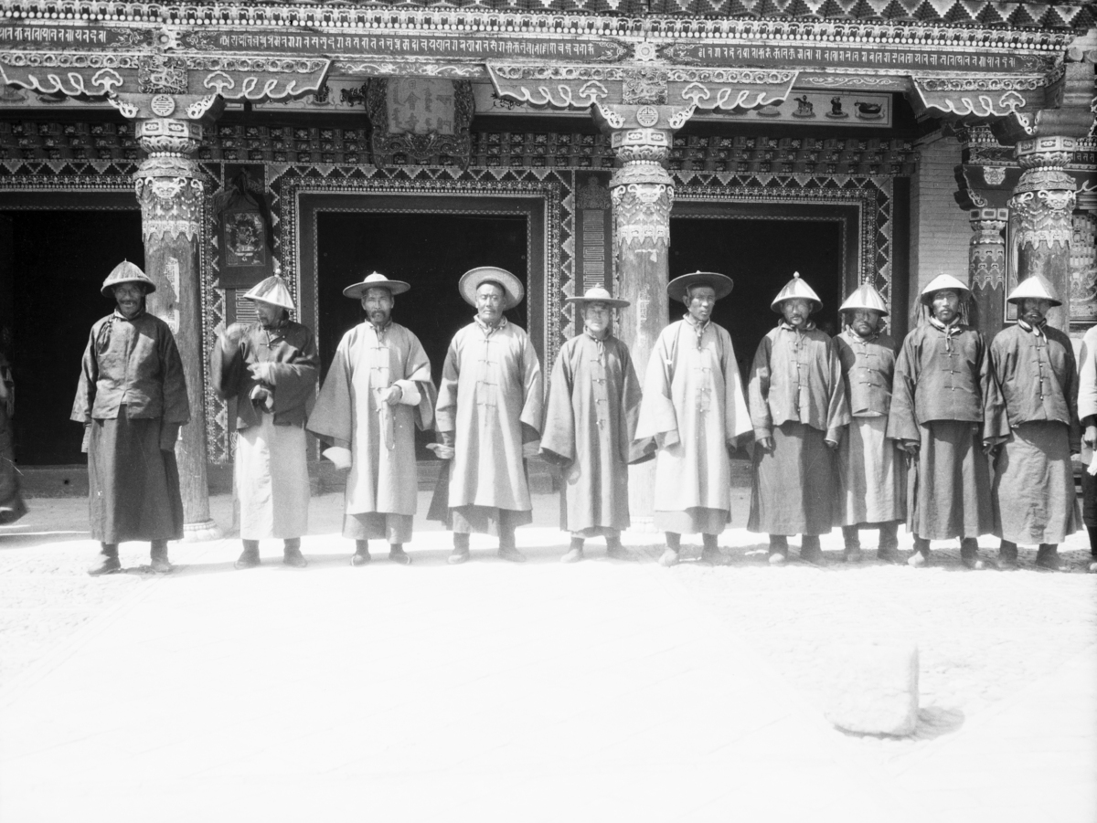 Chao Ho, group of Mongol notables; group of 10 men all wearing same style hat in front of a very elaborate building entrance