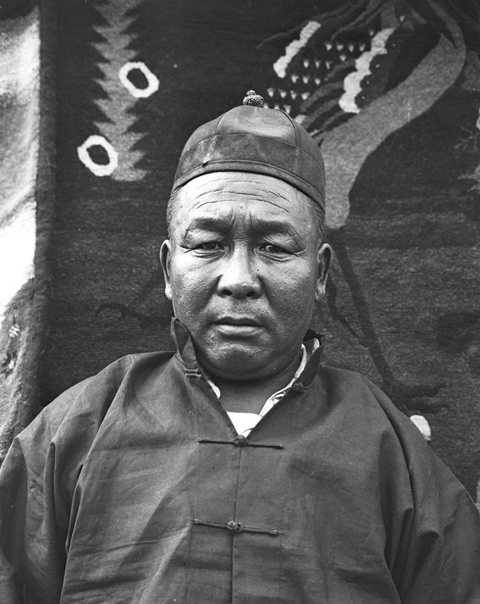 Portrait of Fu Kuan. Chao Ho; The captain of the Mercantile Guard in front of their yurt. They have hung up their Pao-t'ou carpets for a background [off print]
