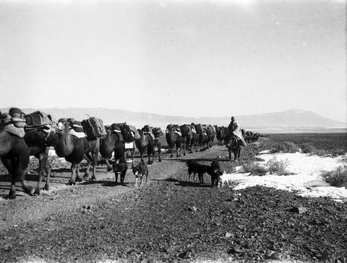 Dead Mongol Pass: way up from Tuhulu; dog alongside camels