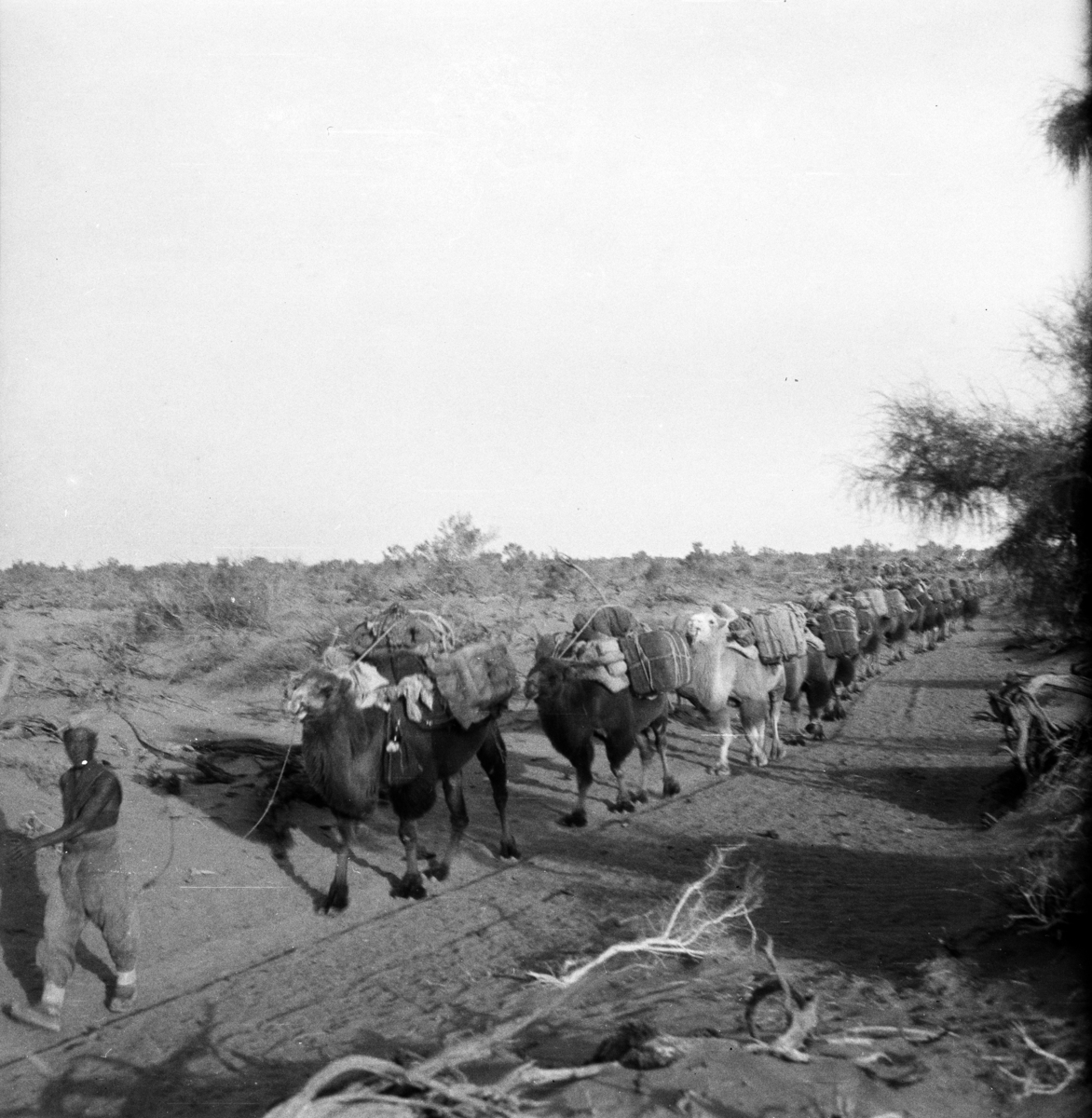 Kuai-tze Hu caravan in sands and tamarisk [Ongt Gol]; caravaneer in the lead