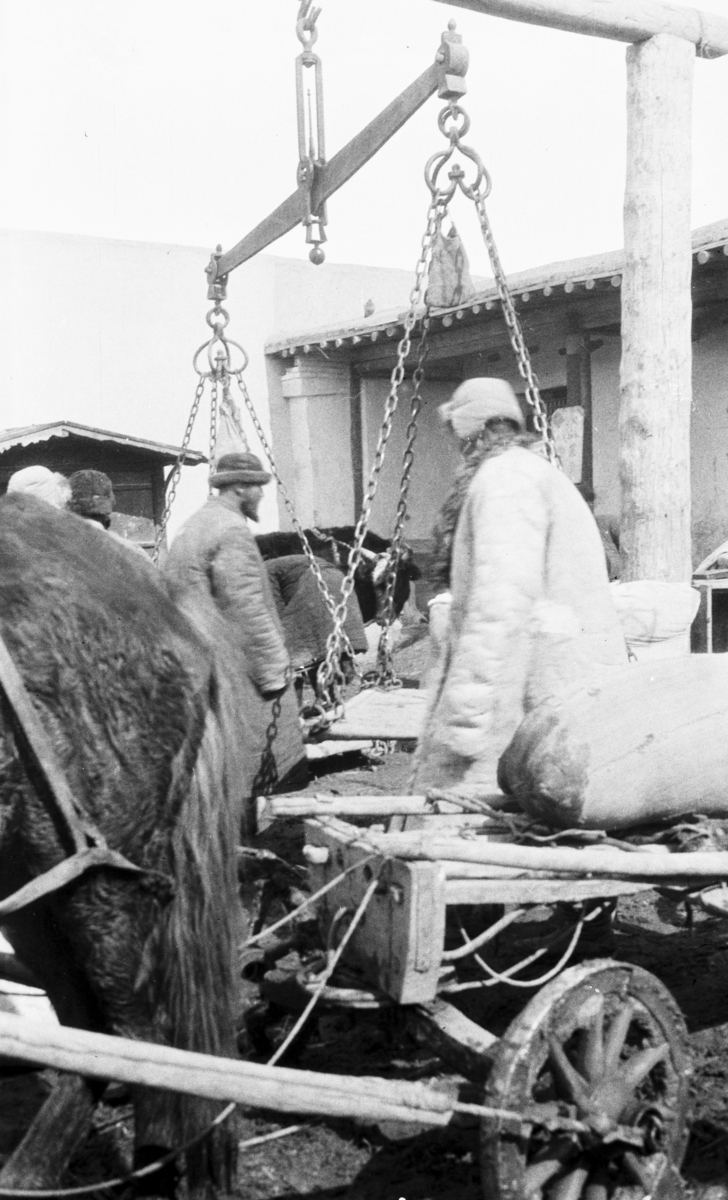 Weighing flour; market in Chuguchat from tape transcript A-12 p 6; ox cart in background; large scale in foreground