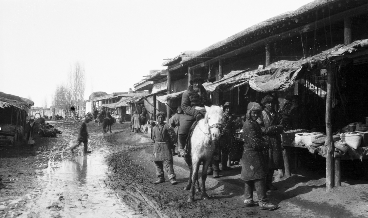 Street in Chuguchak; man on a horse; and several men standing in front of a market stall