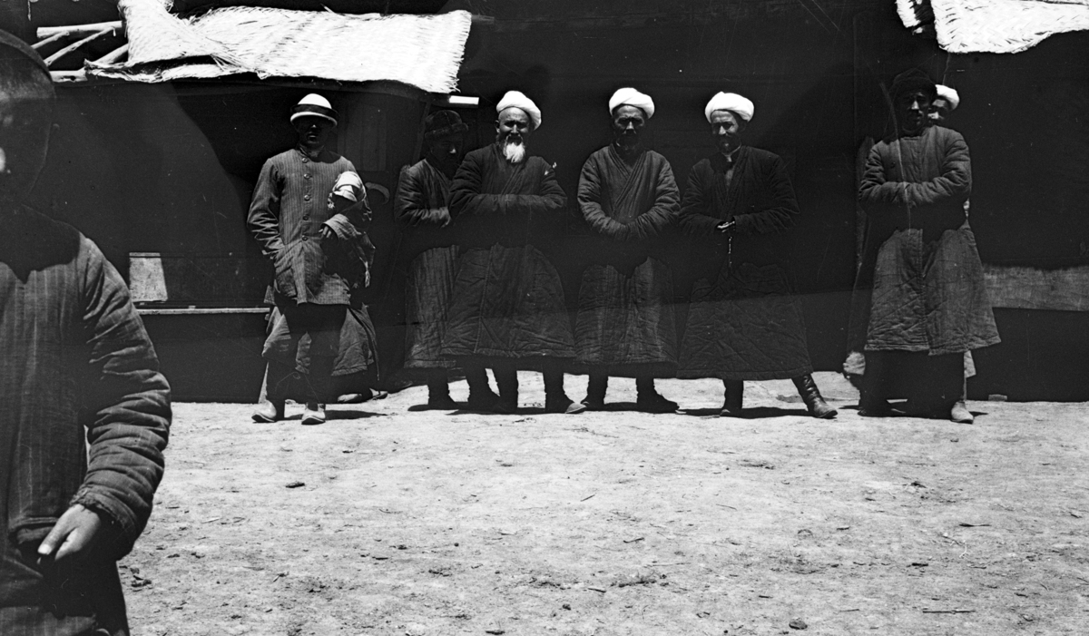 Chantos (Uighurs); 7 men standing in front of a building; 4 are wearing white turbans; look like mullahs