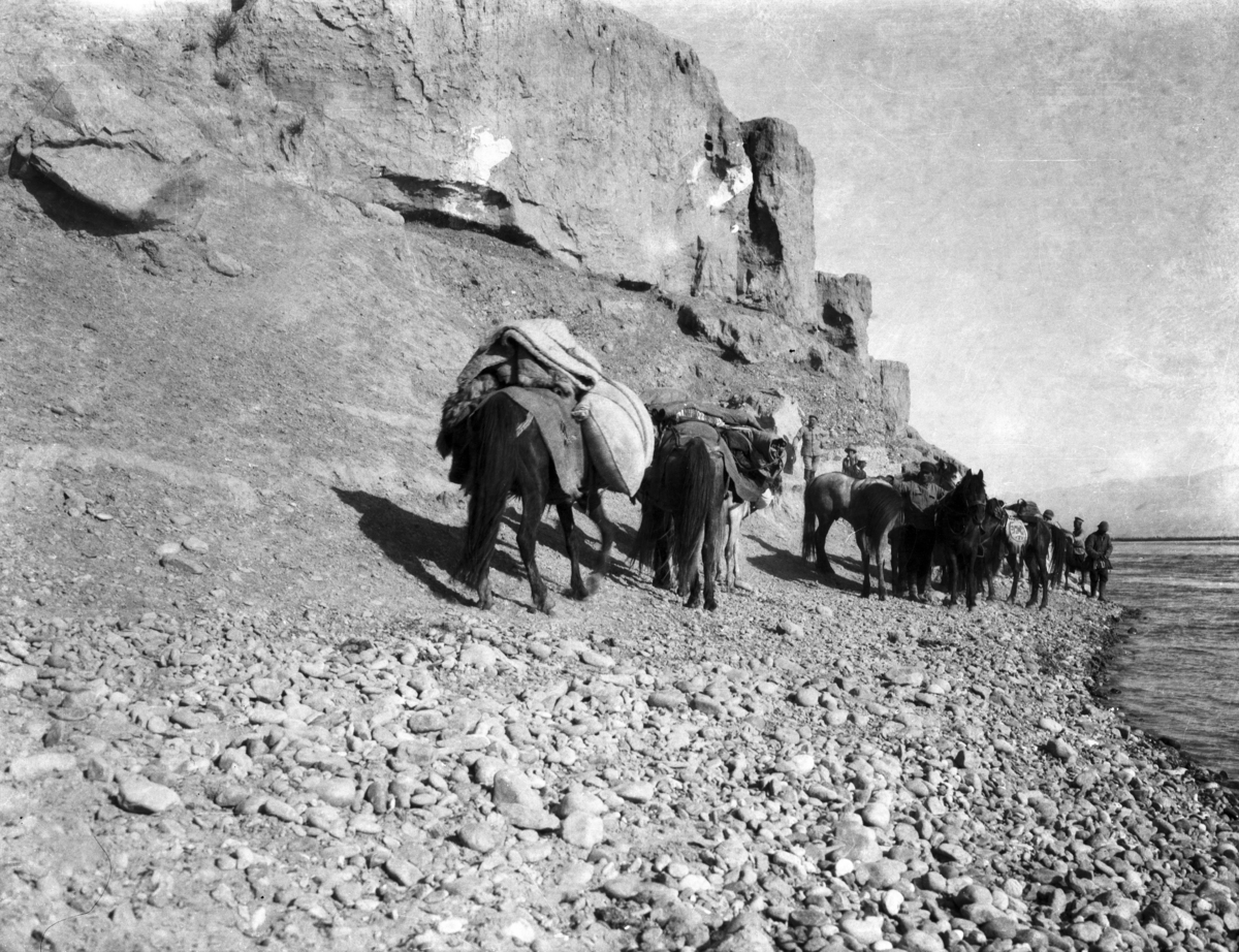 Packs at Ili (river) ford near Kulja [Yining]; caravan assembling to cross Tekes ford, Ili; tape transcript A1 p1