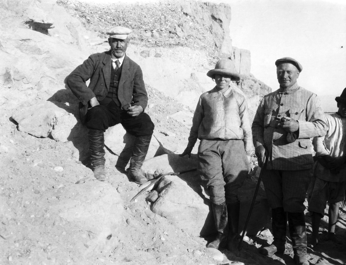 Eleanor [Lattimore] (father) Hufnagel, Tanner; two standing one sitting on a rocky slope