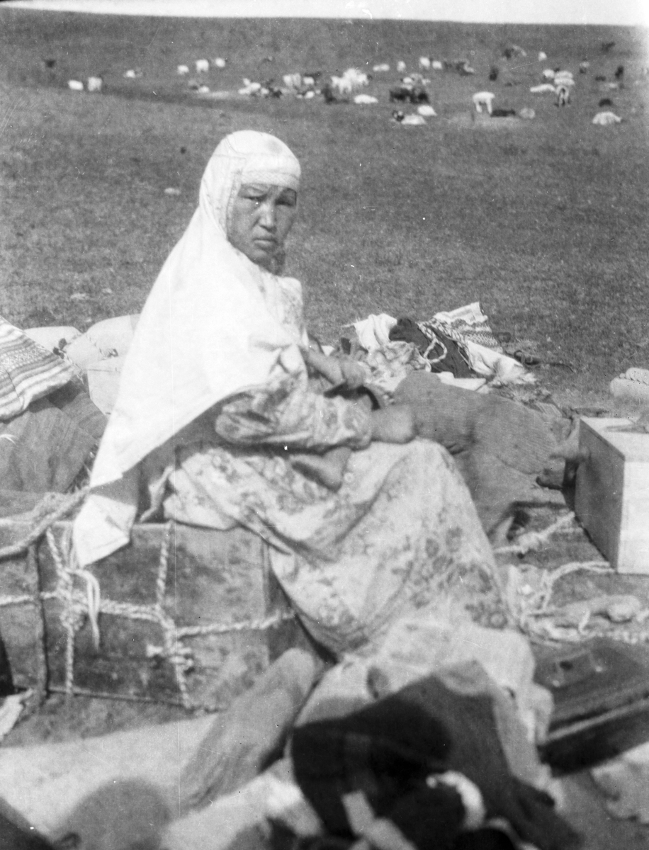 Kazak (Qazaq) woman, first camp; close up woman with head covering sitting on pile of large bundles; sheep grazing in the background