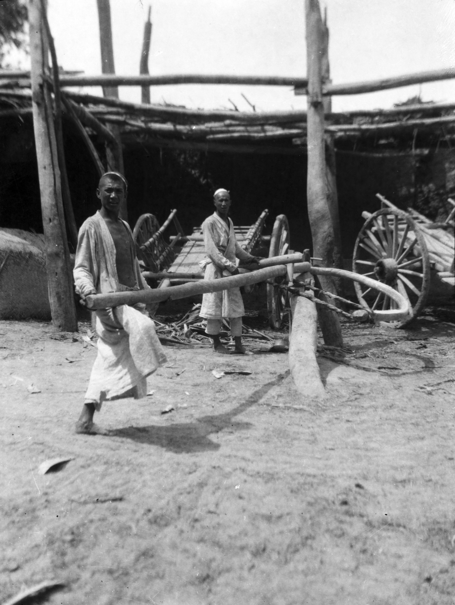 Making cart wheels near Aksu; two men working on a wheel; cars in background; bending saplings to make the rim of a wheel from the tape transcript