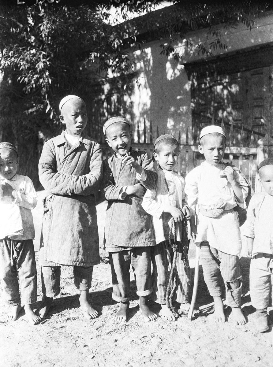 Children at Sui-ting [Huocheng]; 6 barefoot boys standing in front of building