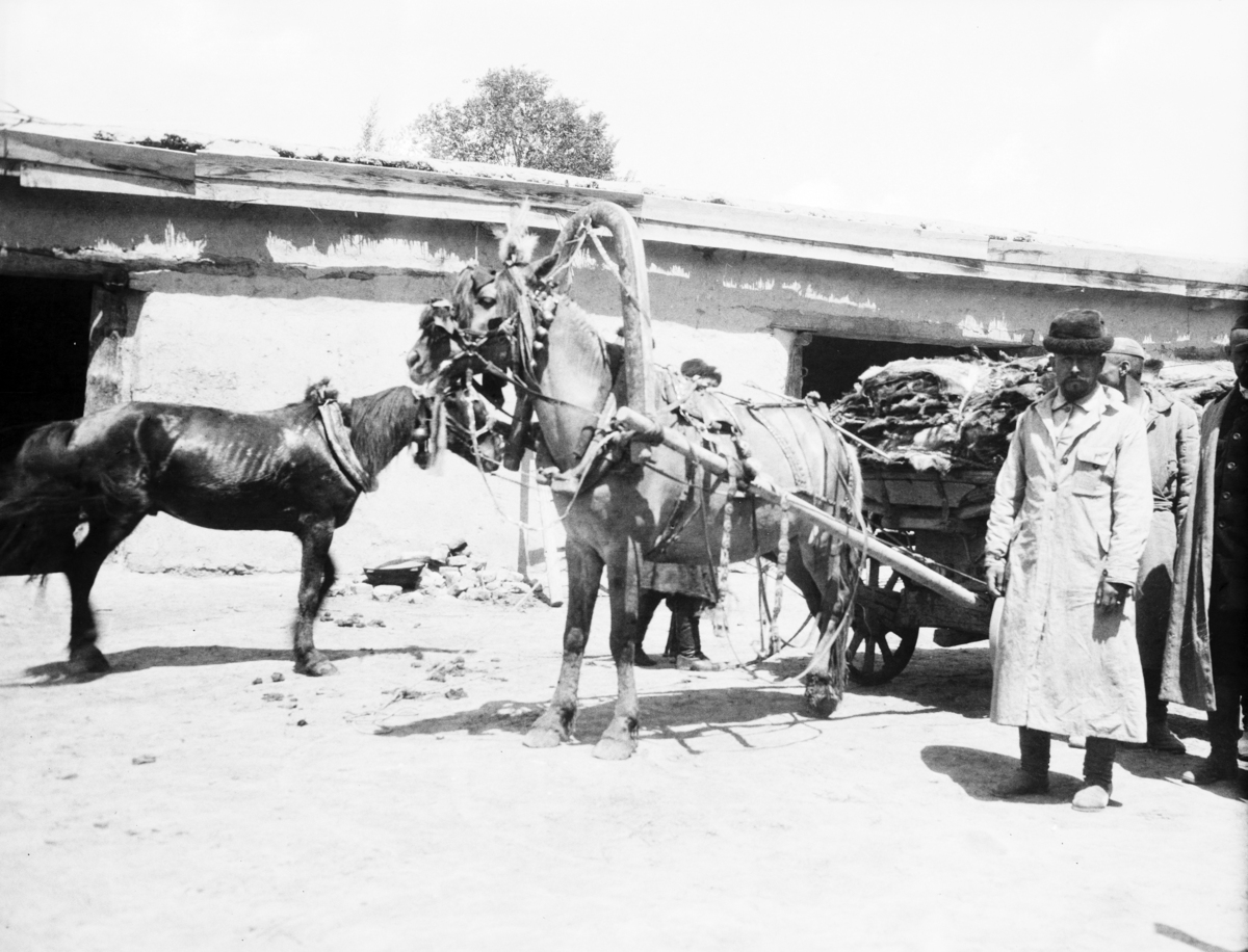 Cartload of marmot skins, Kulja; two horses , one with an elaborate harness; men standing by; Kulja:a cartload of marmot skins belonging to a Russian merchant; standing in front of the cart