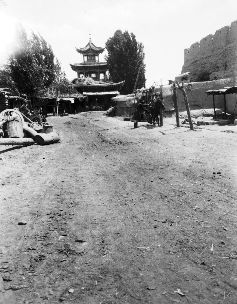 Kulja [Yining] street; pagoda in distance; man working on horse in a slung harness