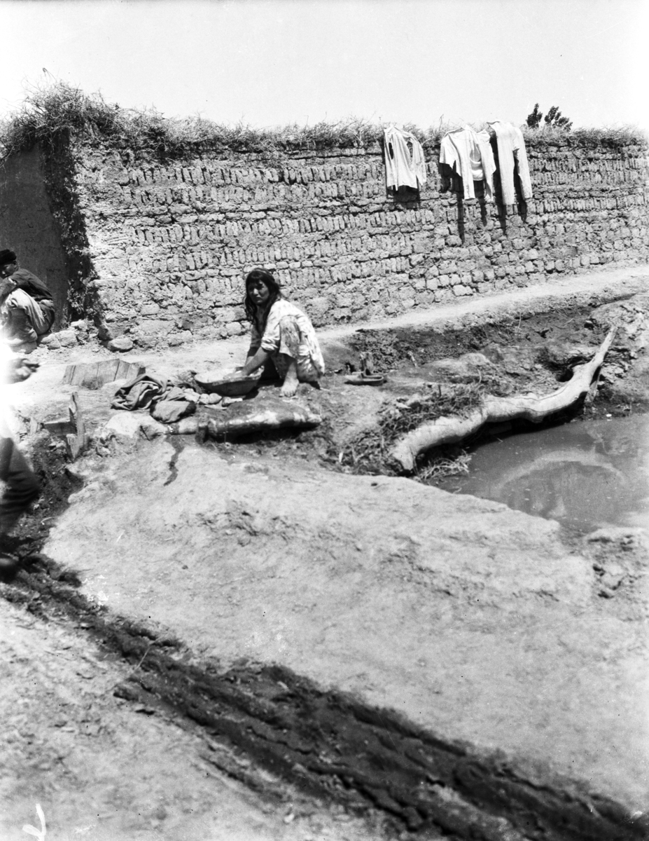 Turki girl washing clothes - Toksun (Toqsun); washing clothes in basin by water; clothes hung to dry on brick wall