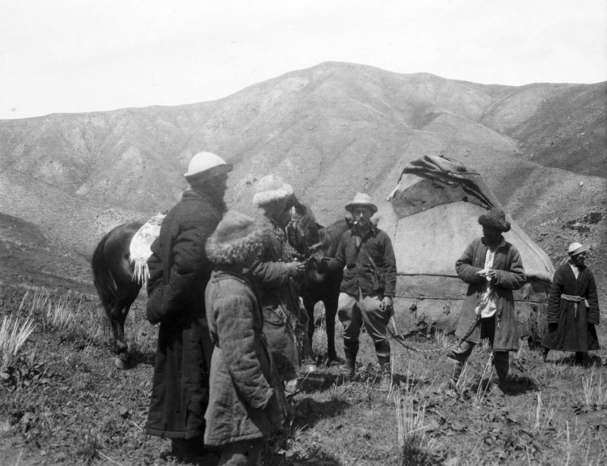 Kazak (Q) encampment, lower Koksu with Owen [Lattimore] and crowd; yurt in background