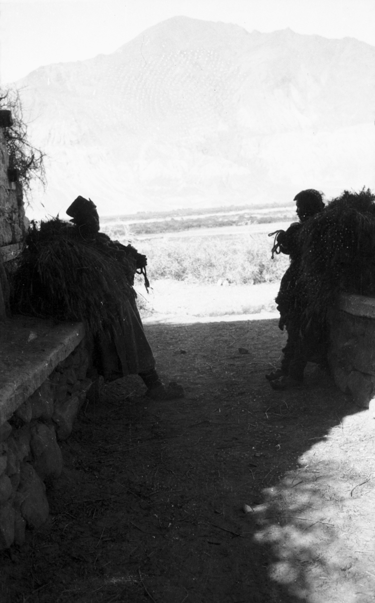 Ladaki (Ladakhi) harvesters; two people sitting large back loads; ditto