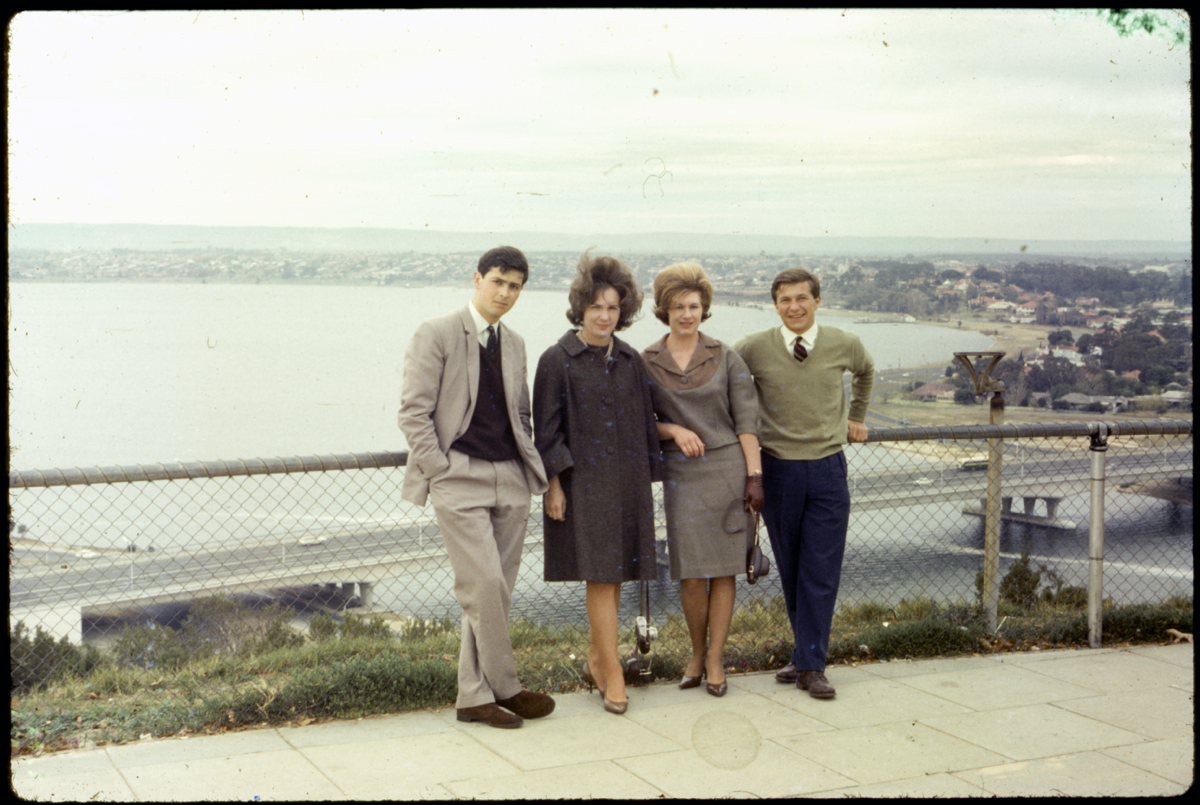 Two European men and two women standing at a look out point with the city of Perth in the distance.