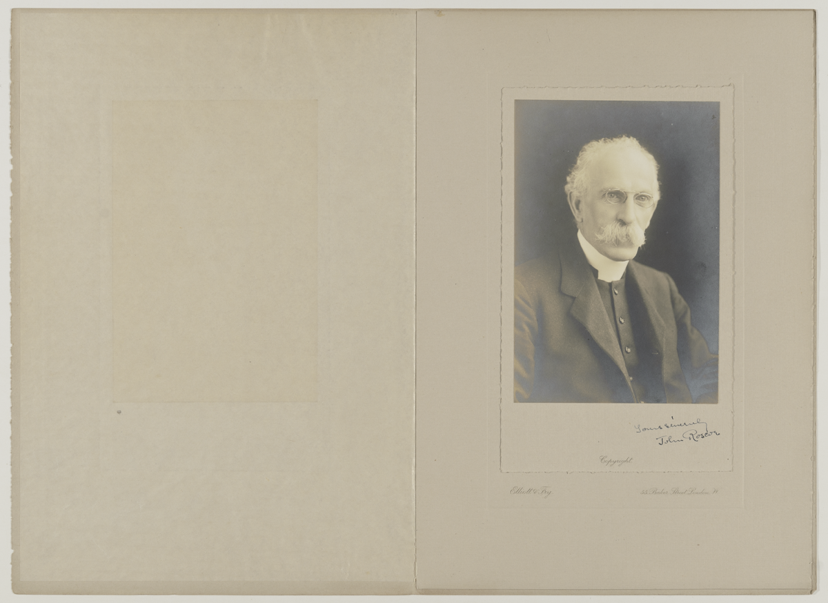 Studio head and shoulders portrait of Rev. John Roscoe, an Anglican missionary and anthropologist who worked in East Africa. Roscoe is shown as an older man with a moustache and wearing a jacket over his clerical collar and robe. [JD 21/07/2020]