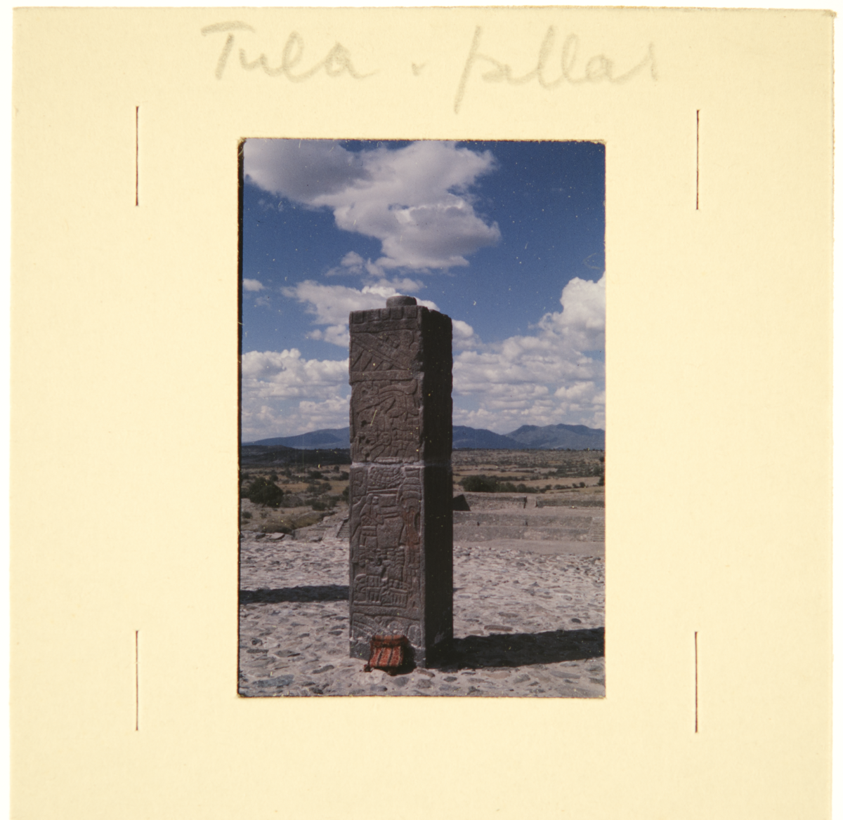 View of the smaller style pillar found at Tula, which is intricately engraved with an anthropomorph, feathers, and possibly a zoomorph. A woven bag is used for scale in the photograph. [TB 9/3/2015]