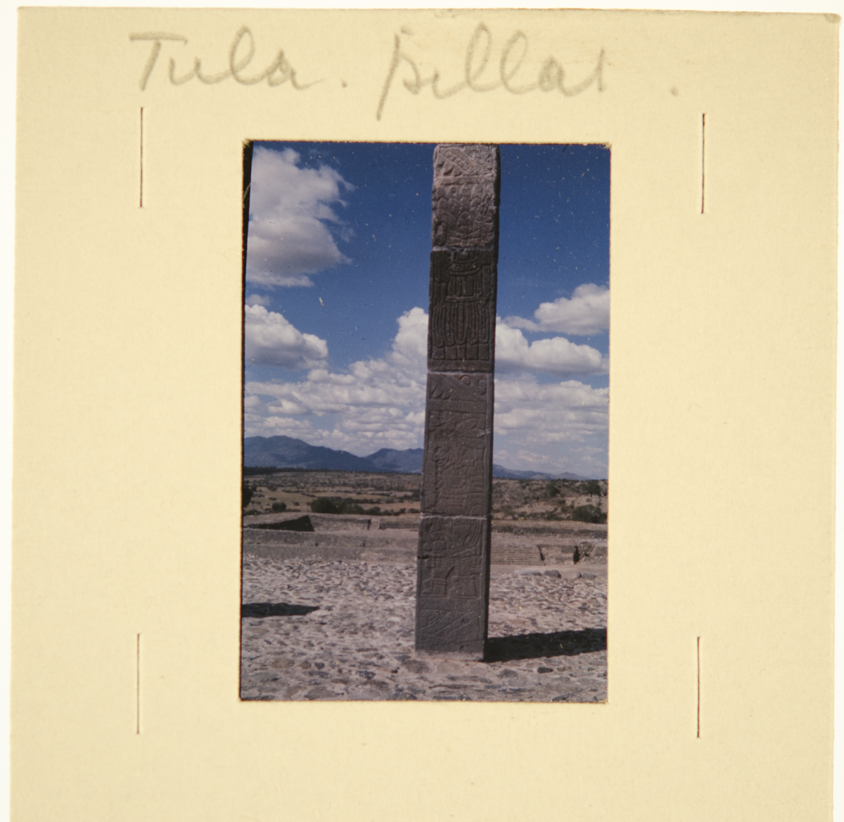 View of a squared edge pillar, with some engravings, with the rest of the plaza in the background. [TB 9/3/2015]