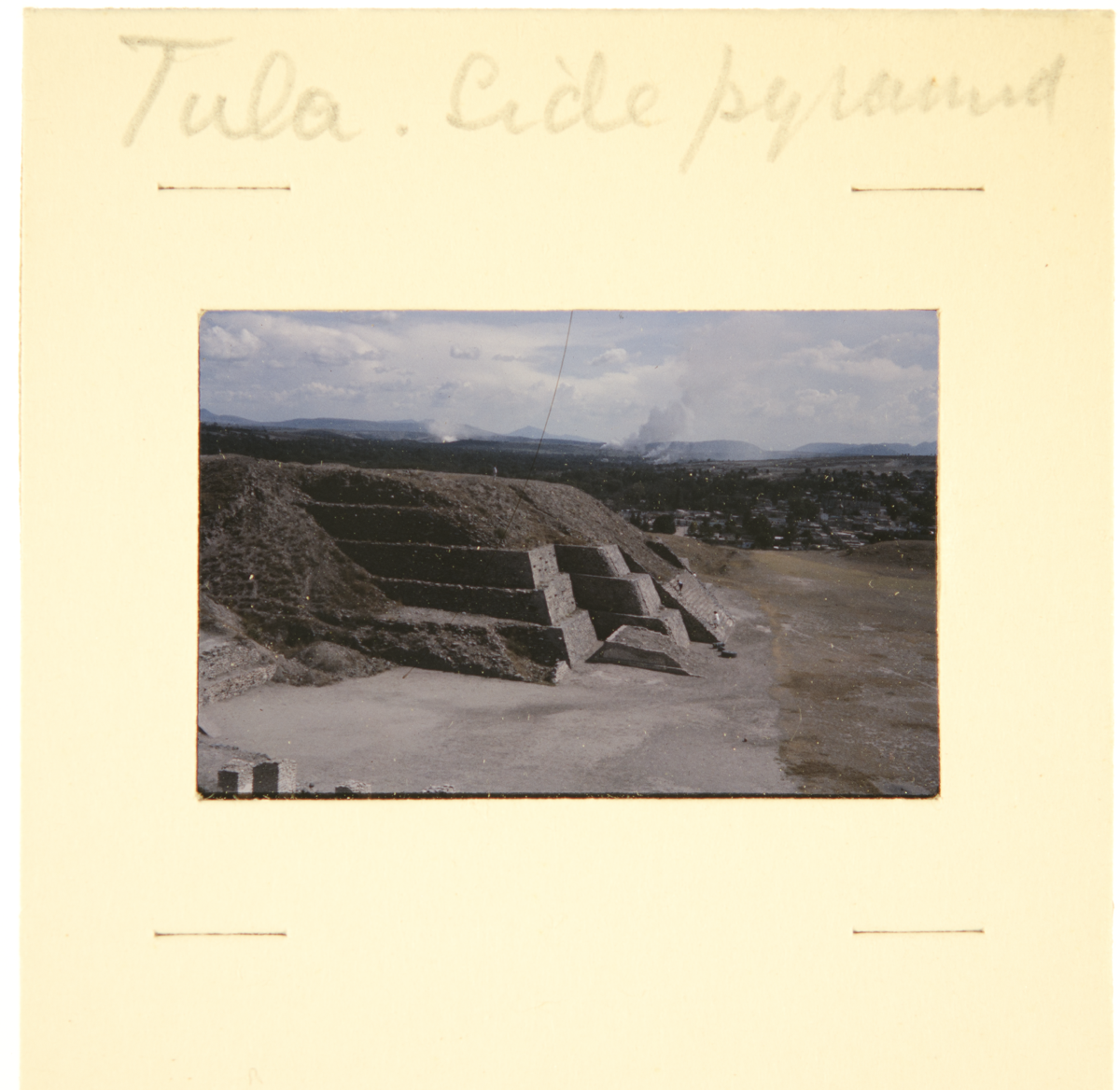 Taken at a high vantage point, this shows the grand size of Tula and is a side shot of the steppe pyramid known as the Templo de Tlahuizcalpantecuhtli, ‘House of the Morning Star’. Mountains and clouds are in the background. [TB 9/3/2015]