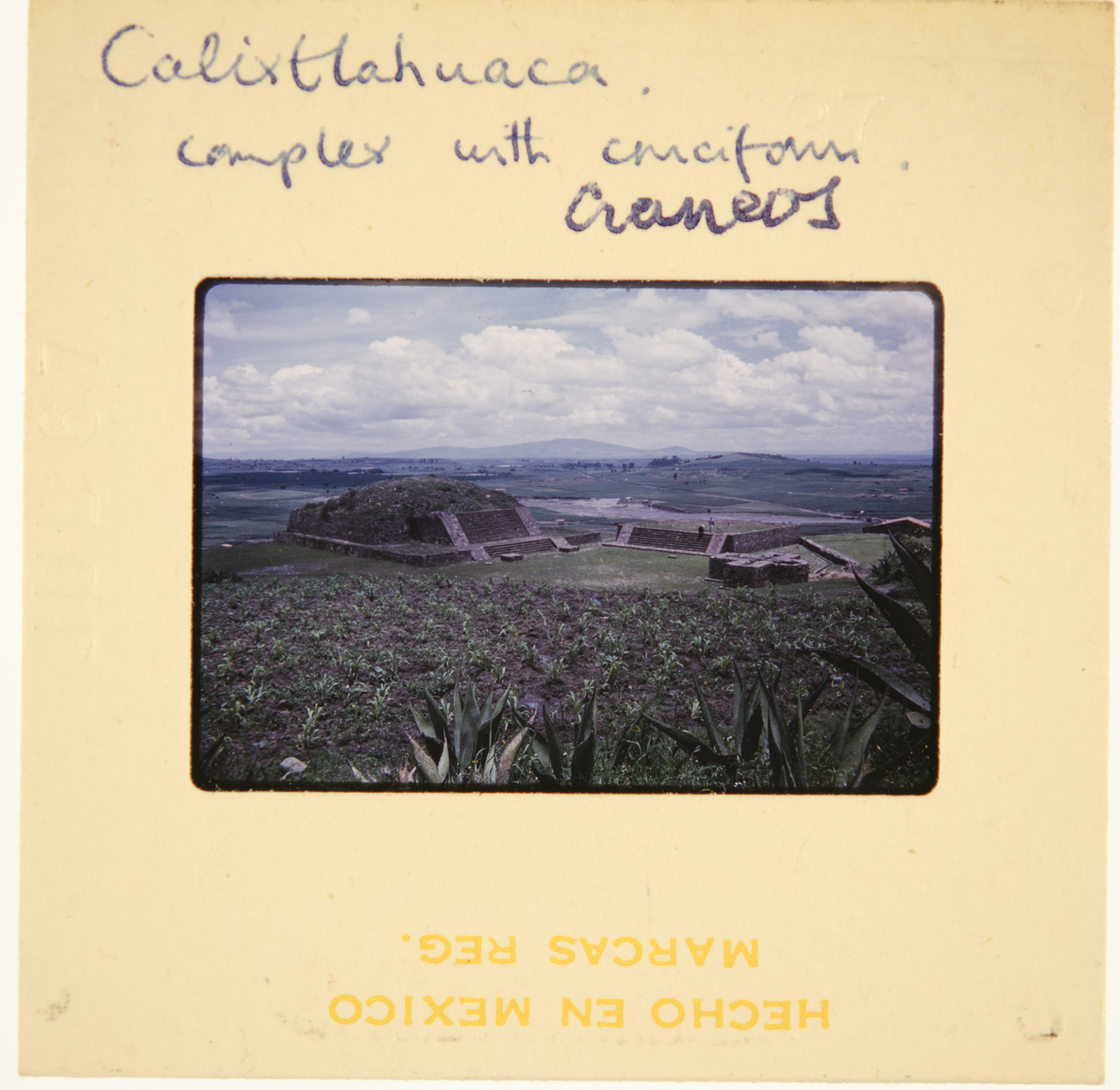 View of the ruins and surrounding landscape of Calixtlahuaca featuring a large stone cross in the plaza of the ruins. [TB 20/4/2015]