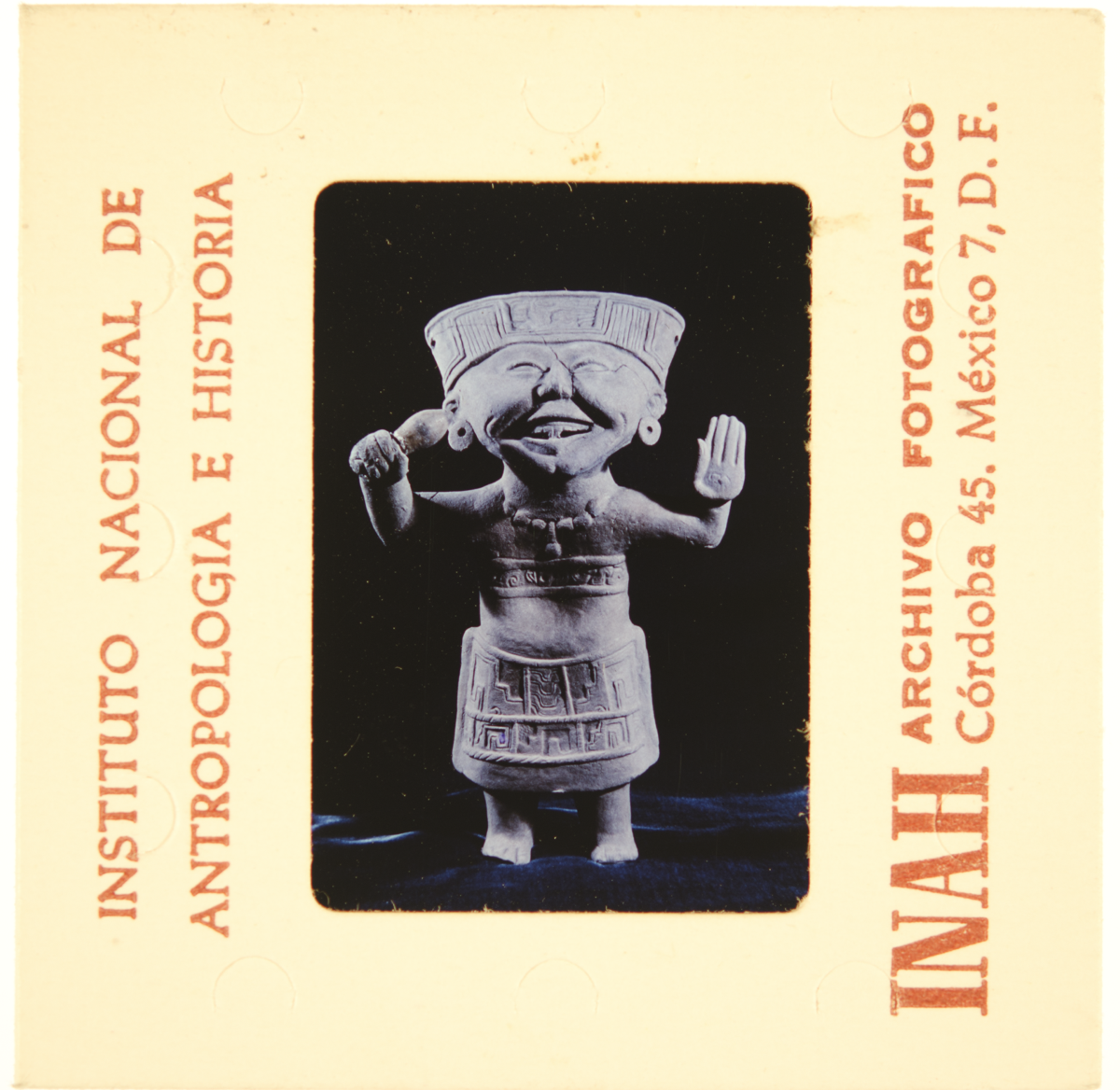 Documentary photograph of a ceramic smiling figure with the tongue protruding out and no arms in the armholes, probably from Totonaca culture, now held at the Instituto Nacional De Antropologia E Historia (National institute of anthropology and history), Mexico City. [TB 27/4/2015]