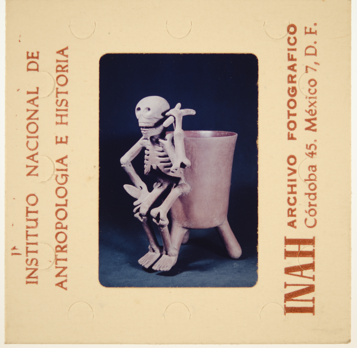 Documentary photograph of a tripod vessel with a skeleton attached to the body of the pot, probably from Mixteca culture, now held at the Instituto Nacional De Antropologia E Historia (National institute of anthropology and history), Mexico City. [TB 27/4/2015]