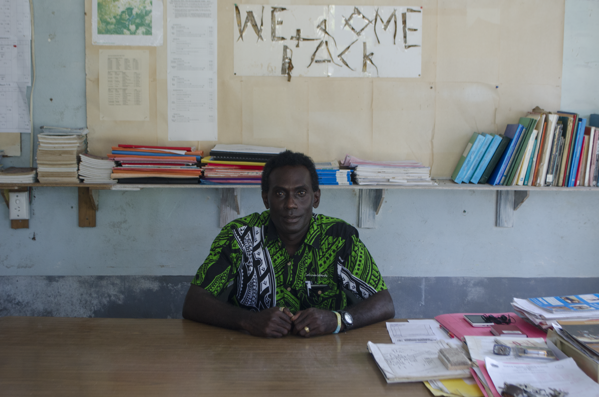 Portrait of Murray Navo, the principal of Hiram Bingham High School, seated at a desk in his office.