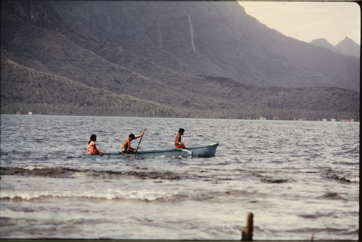Bibliographical reference: Poignant, A. and Poignant, R. 1976. Children of Oropiro. London: Angus and Robertson, p.18-19. This extract is from a children's book about children named Eti, Timi, and Sylviane and their life in Raiatea: "The friends had not gone far before they came upon a canoe drawn up on the beach.