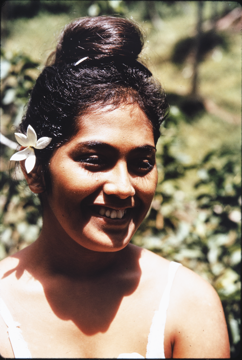 18. Girl wears flowers of tiare apetahi behind her ear." [Poignant's manuscript]