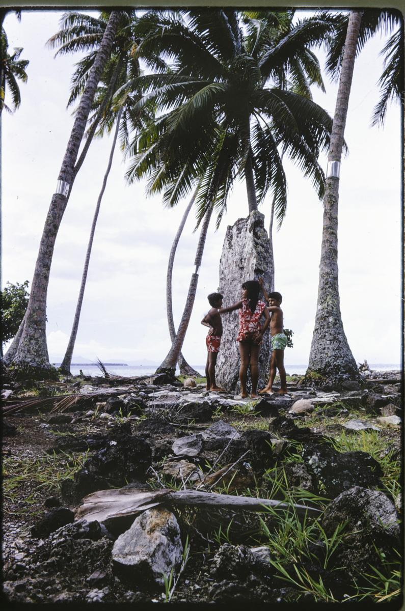 [22.]15. various shots of Turo and children, or Henriette and children v. the stone of investiture called Te-pap-tea-ia-ru'el. Here the chiefs were given the red uru belt. A living man had been buried beneath it." [Poignant's manuscript]