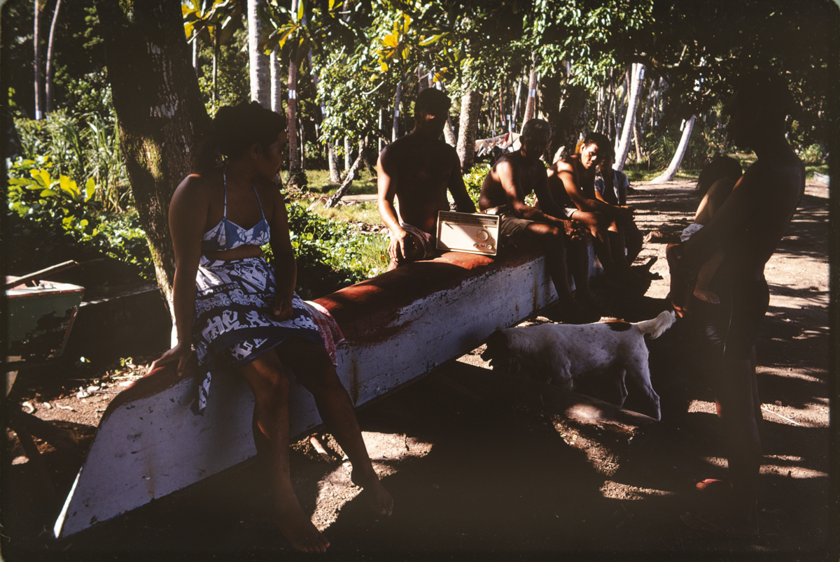 A group of four men, a woman, two children, and a dog gathered around a radio placed on an upturned boat in Fetuna. Farika (also spelt Fareka), the woman, is sitting opposite Turo, her husband who is holding an infant. Ro'o is holding the radio. [KK 27/09/2022]