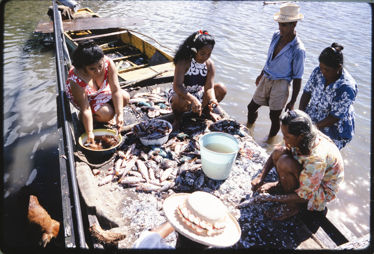 Bibliographical reference: Poignant, A. and Poignant, R. 1976. Children of Oropiro. London: Angus and Robertson, p.12. This extract is from a children's book about children named Eti, Timi, and Sylviane and their life in Raiatea: "Every now and then the men prepared a feast for some important visitor. Eti and Timi's mouths watered as they watched the men pack the food into the big earth oven. A fire burnt all night, heating the stones for the oven. In the early morning the pit was lined with them and layers of chicken, pork, and fish in palm-leaf packets, were quickly placed over them. Trays of poi — a soft mixture of papaya and breadfruit — were placed on top, and bunches of fei – the wild bush banana – and halved breadfruit stacked round the edge. Water was added to make steam, then all was quickly covered with layers of green banana leaves, and sealed with sacking and earth.